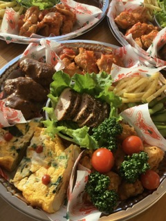 ふわとろ煮込みハンバーグ チキンのトマト煮込み スペイン風オムレツ からあげ ポテト 枝豆 鴨のパストラミ